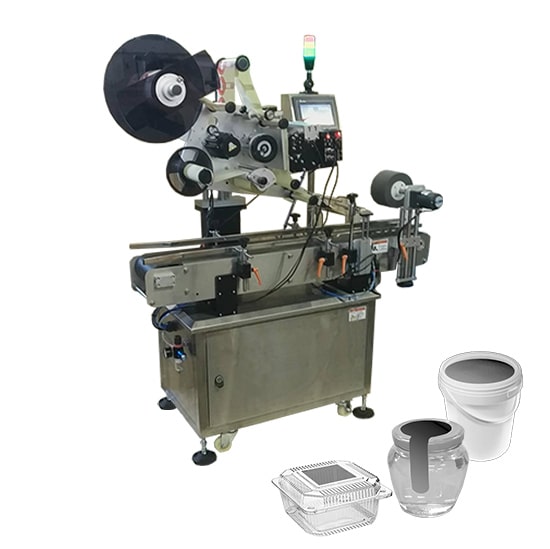 Máquina automática para aplicar etiquetas autoadhesivas en la tapa del envase.