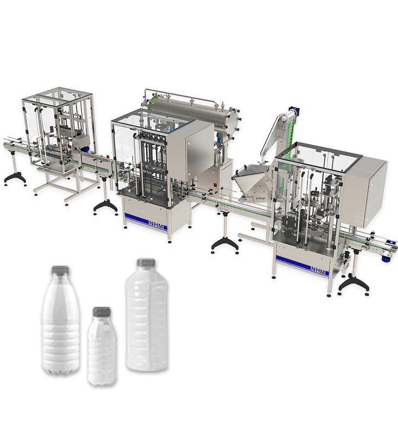 La línea de llenado automático de botellas de PET, HDPE y vidrio está diseñada para enjuagar, llenar productos líquidos y viscosos (leche, kéfir, yogur para beber, jugos, salsas, pasta de chocolate, miel, etc.) y luego tapar las botellas con diferentes tipos de Tapas: rosca, rosca o manga. A continuación, las botellas se imprimen y etiquetan con una película autoadhesiva, de manga o de polipropileno en rollo.