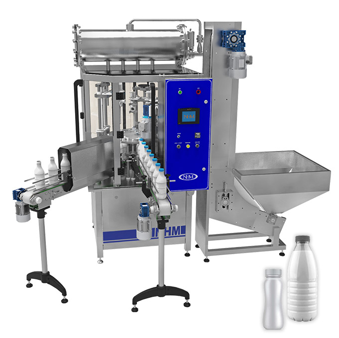 Línea automática de llenado de botellas de PET, HDPE y Vidrio. La línea de llenado está diseñada para enjuagar botellas, llenar productos viscosos y líquidos (leche, kéfir, yogur, jugo, aceite de girasol, mermeladas, salsas, etc.) con tapones adicionales (tapón de rosca, tapón de rosca, tapón a presión) y etiquetado de botellas: autoadhesivo, manga, alimentación en rollo.